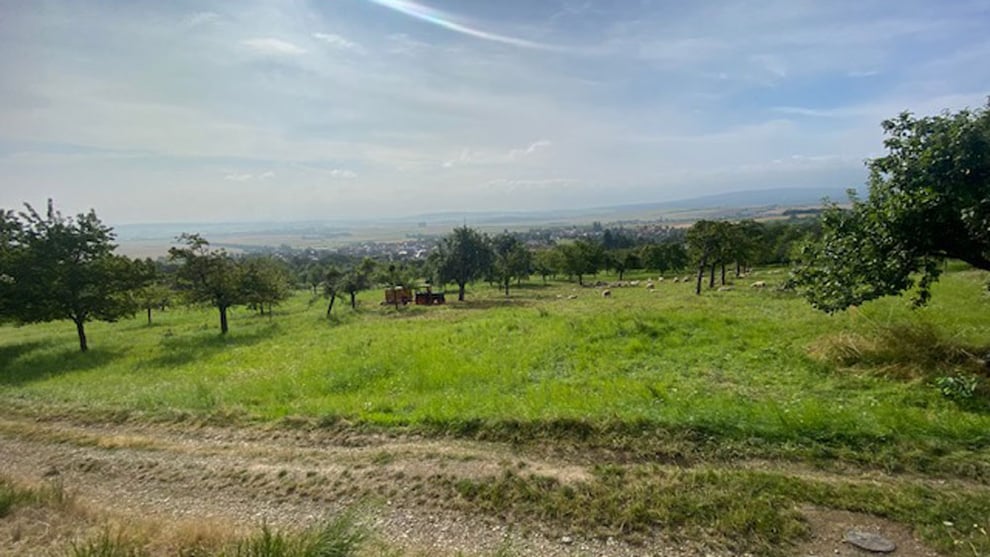 Auf unserer Reise durch Butzbach befinden wir uns hier am nördlichen Ortsrand von Hoch-Weisel. Hinter uns der Butzbacher Wald mit einer geschützten Wachholderheide. Vor uns die Streuobstwiesen, mit vielen verschiedenen Apfel-, Pflaume-, Kirsch und Birnbäumen. Das Auge schweift über den Stadtteil Hoch-Weisel, in der Ferne ist die Stadt Butzbach zu erkennen.